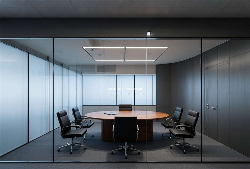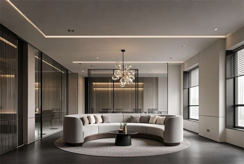 本方案采用現(xiàn)代簡(jiǎn)約設(shè)計(jì)語(yǔ)言,整體空間以淺灰、白、原木三色為主基調(diào)。前臺(tái)區(qū)設(shè)置懸浮式接待臺(tái)與發(fā)光LOGO墻,搭配LED線性照明塑造企業(yè)形象。開(kāi)放式辦公區(qū)采用模塊化工位布局,通過(guò)玻璃隔斷劃分功能區(qū)域,保證自然采光最大化的同時(shí)提升空間通透感。智能會(huì)議系統(tǒng)集成于各會(huì)議室,配備電動(dòng)投影和書(shū)寫玻璃墻。經(jīng)理室采用深藍(lán)色烤漆木飾面提升商務(wù)質(zhì)感,休息區(qū)設(shè)置咖啡吧與卡座強(qiáng)化員工關(guān)懷。走廊運(yùn)用導(dǎo)視燈帶串聯(lián)各區(qū)域,茶水間六角地磚增添趣味性。培訓(xùn)室階梯式布局配合吸音墻面確保聲學(xué)效果,電話間磨砂玻璃立方體兼顧隱私與采光。VIP室智能霧化玻璃實(shí)現(xiàn)空間靈活轉(zhuǎn)換,整體設(shè)計(jì)注重功能分區(qū)與人文關(guān)懷的平衡。