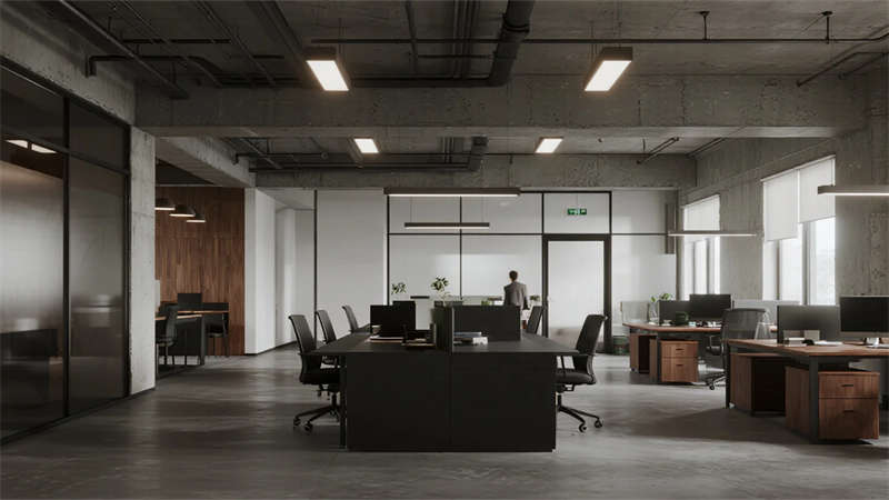 這組工業風辦公室設計以裸露結構和復古質感為核心,通過混凝土、金屬和木質材料的碰撞,打造出兼具實用性與藝術感的辦公空間。空間保留了建筑的原始肌理,如天花板的管線和墻面的磚紋,搭配黑色鐵藝家具和深色調軟裝,營造出冷峻而富有張力的氛圍。局部通過皮質沙發、綠植和暖光燈具軟化工業風的硬朗感,增添人文氣息。