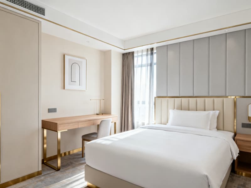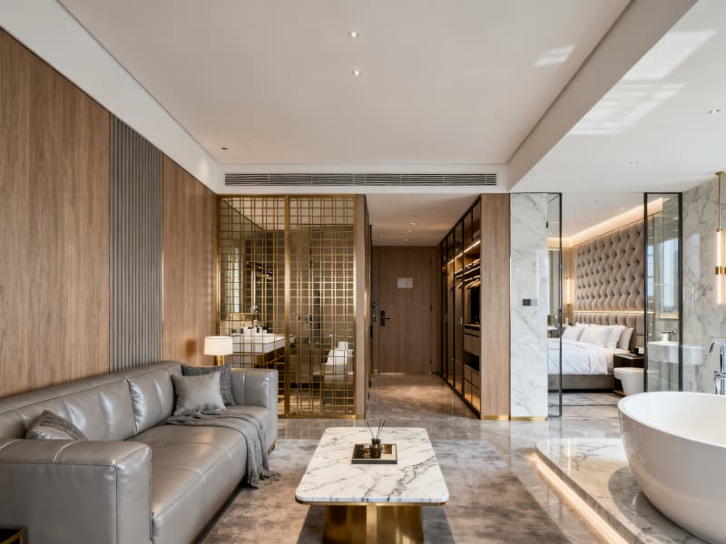 在空間布局上,充分利用4500平的開闊尺度,合理劃分大堂、客房、餐廳、宴會廳、健身中心等功能區(qū)域。各區(qū)域銜接順暢,既保證商務出行的高效便捷,又滿足休閑旅居的舒適體驗——例如標準客房注重實用性與靜謐感,行政套房強化尊貴感與功能性,宴會廳兼顧多元場景適配,健身中心與茶吧則豐富旅居生活維度。