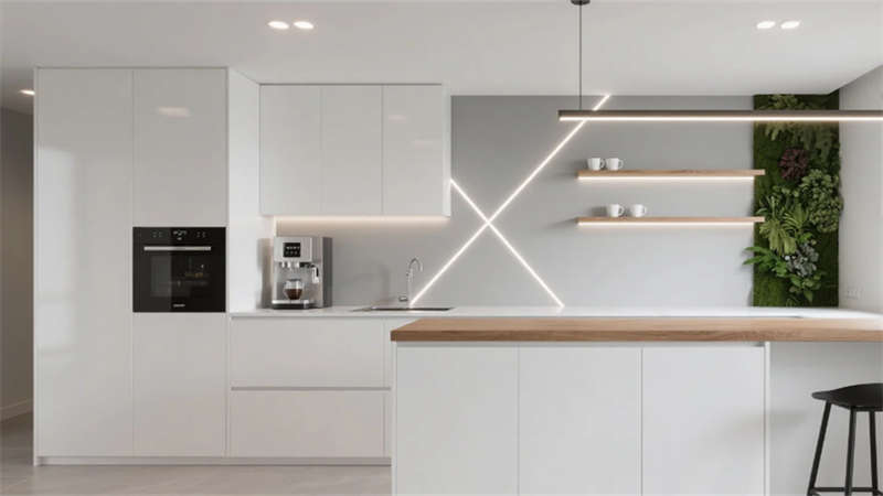 高管辦公空間彰顯差異化設計:經理辦公室以木格柵墻面與模塊沙發營造親和力,總裁辦公室則通過深胡桃木隱形門、弧形沙發與城市景觀落地窗凸顯沉穩氣度。多功能廳采用可伸縮隔斷與嵌入式LED屏,適應培訓、會議等多場景需求;茶水間以中島吧臺與幾何層板打造輕松社交空間,筒燈聚焦的綠植墻增添生機。