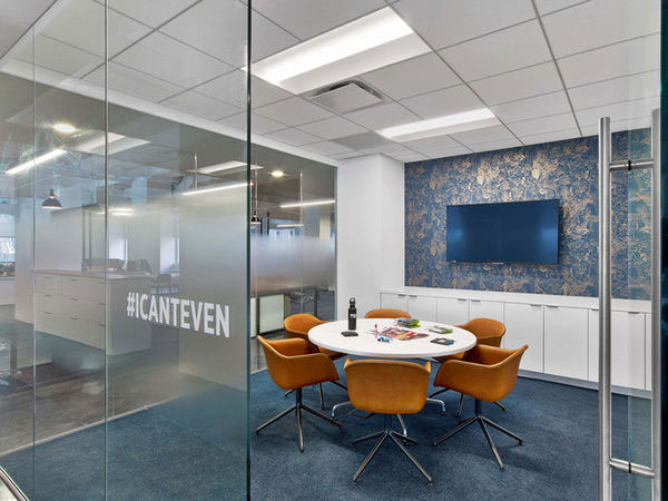 清朗凝練的空間更多了一份雍容典雅的都市氣質(zhì),依舊以藍色標志色為裝飾主調(diào),只是這次的藍色更暗雅、更富于細膩的變化。極富質(zhì)感的白蠟木材質(zhì)與黑色碳鋼構件制作的家具,呈現(xiàn)出特有的都市氣質(zhì)。閉合的洽談室和會議室大多聚集于空間的內(nèi)部,以盡可能留出沿窗的空間令視線不被遮擋。連續(xù)而開敞的玻璃窗,讓室外城市美景盡收眼底,心情也變得豁然開朗。