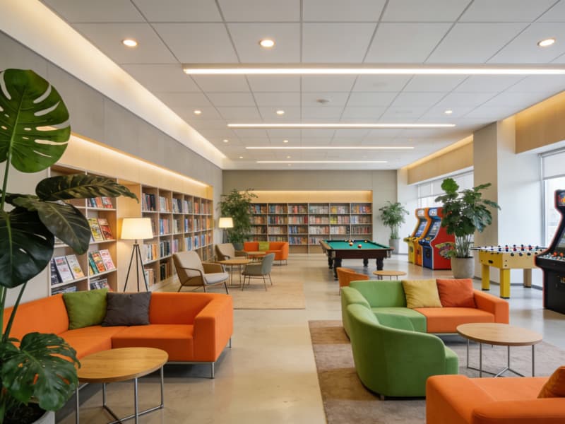員工休息區(qū)充滿活力與溫馨,彩色的沙發(fā)錯落擺放,搭配綠植與休閑桌椅,為員工打造一個放松身心的舒適角落。還設(shè)置了小型的閱讀區(qū)與娛樂設(shè)施,豐富員工的業(yè)余生活。