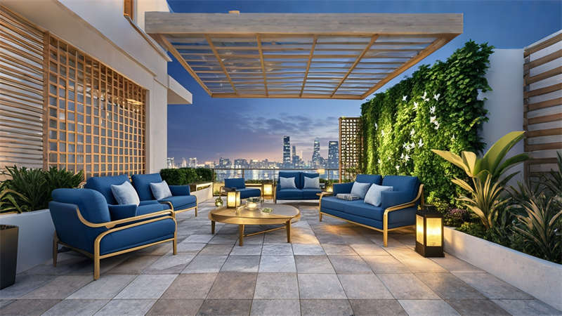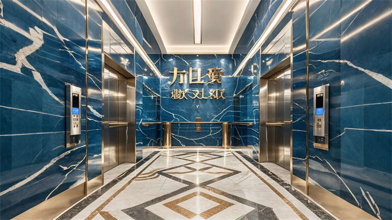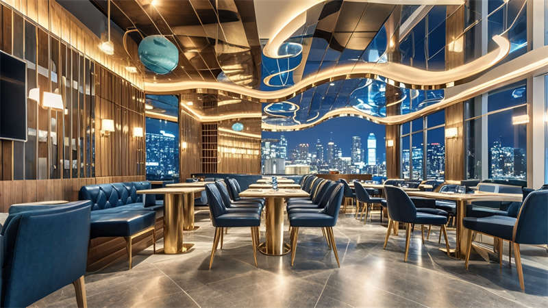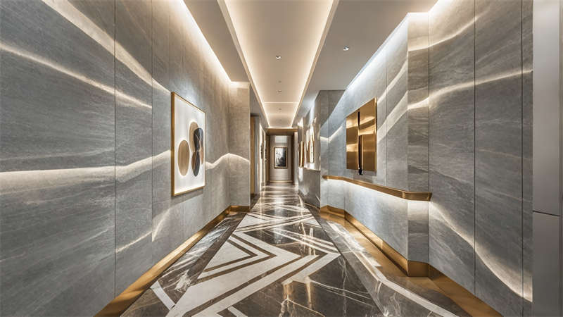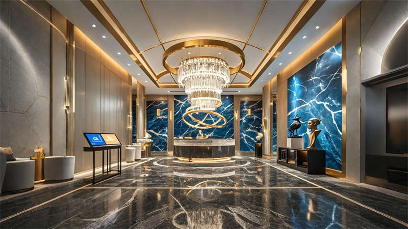 色彩體系以香檳金與深海藍(lán)為主調(diào),大堂采用香檳金金屬線條勾勒建筑肌理,搭配深海藍(lán)大理石營(yíng)造視覺(jué)重心。客房區(qū)運(yùn)用暖灰硬包墻面平衡色彩強(qiáng)度,通過(guò)2700K暖光與4000K中性光分區(qū)照明塑造晝夜場(chǎng)景。材質(zhì)組合注重層次:大理石地面、金屬構(gòu)件、絨布軟包形成質(zhì)感三部曲。