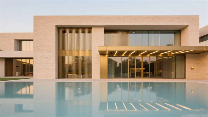 建筑外觀通過香檳金格柵與玻璃的虛實對話,成為城市界面的優(yōu)雅符號。室內外空間流暢銜接,光影在金屬、石材與水體間自然游走,最終凝聚成兼具現代鋒芒與人文溫度的都市謐境,為賓客提供超越尋常的精神棲居。