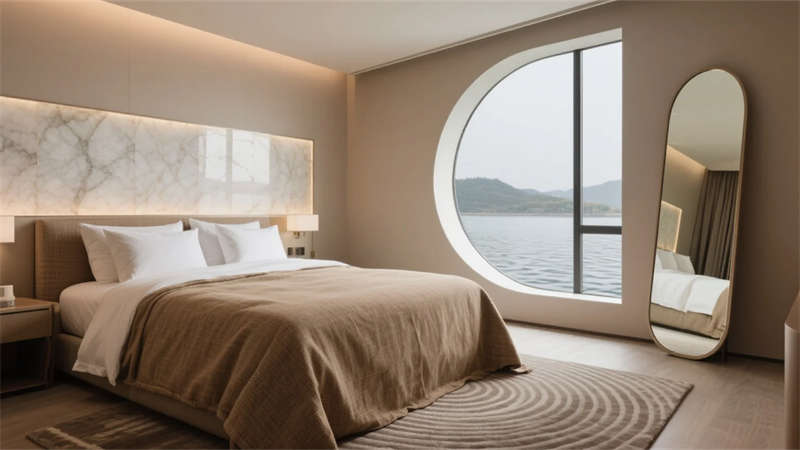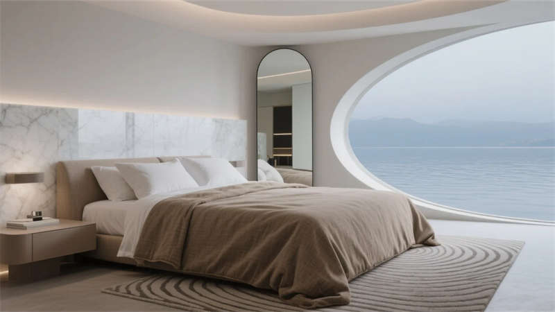 每一處細節(jié)皆成藝術現(xiàn)場——走廊夯土墻鐫刻時光肌理,發(fā)光地磚指引探索路徑;臥室弧形鏡面折射虛實,讓人沉入湖居夢境。這里不僅是棲居之所,更是一場喚醒感官的在地美學巡禮,讓合肥的湖韻林語,成為流淌于日常的奢享印記。