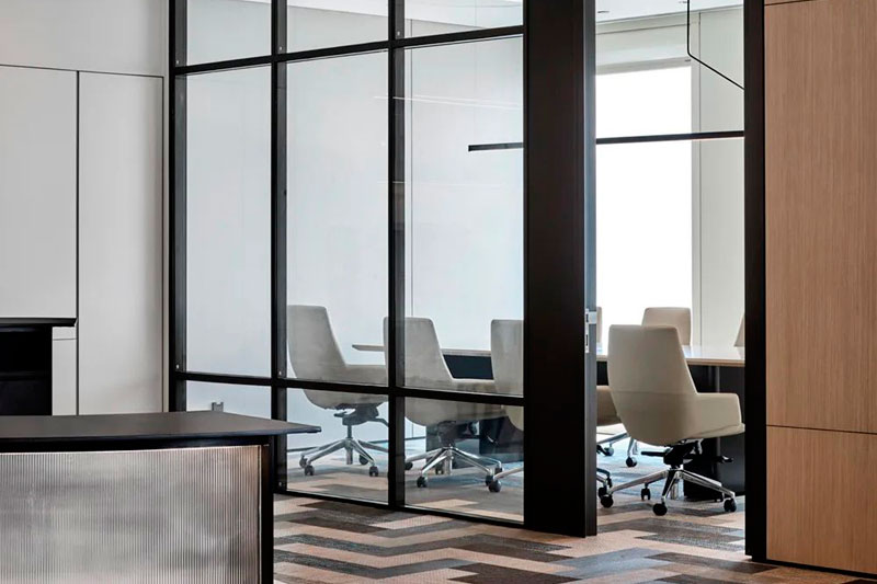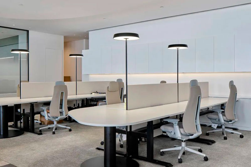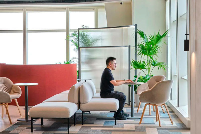 后場辦公區(qū)延續(xù)了前廳的辦公理念,結合不同功能形式的會議室、電話間,提供了多選擇的工作模式,簡潔而高效。大量可再生面料的墻飾、可回收吸音板和仿生苔蘚的應用,豐滿了視覺層次并極大提升了空間的聲學效果。
