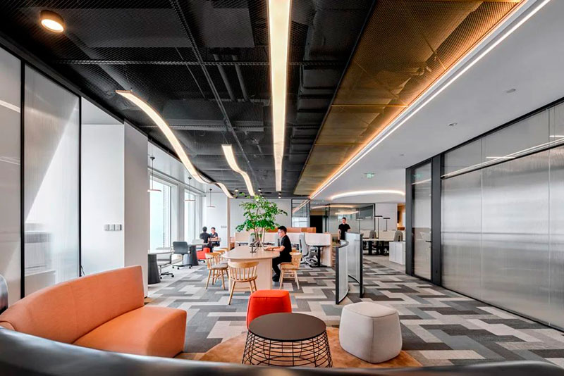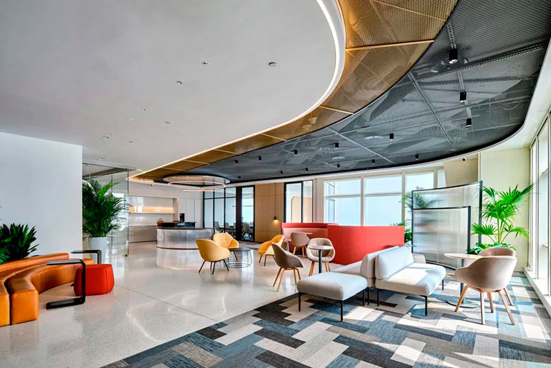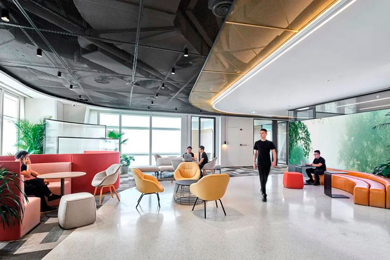 不同于投資公司的傳統(tǒng)形象,設計師以一個圓島吧臺和開敞的自由交流區(qū)作為前廳接待場所。大量的自然光涌入室內,明凈開闊。天花地面是圓轉流動的曲線造型,采用水磨石地面、金屬網天花、Bolon塑膠地毯等各種新環(huán)保材料,輔以色彩鮮麗的多功能家具組合、大型LED屏和隨處點綴的綠植,呈現(xiàn)出年輕、現(xiàn)代、科技而又充滿能量的生命氣息。