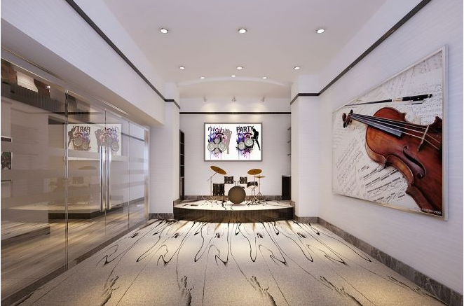 本次設計將現代元素和傳統元素結合在一起,以現代人的審美體驗來打造一個個性化的音樂培訓中心。以跳動的音樂節奏旋律進行抽象化,采用局部色彩點綴,對形式進行創新,對材質進行重組,用線條和色彩來分割視覺比例,使用新型輕質隔墻保證良好的隔音,簡潔童趣的墻貼為整個空間增添了生機。