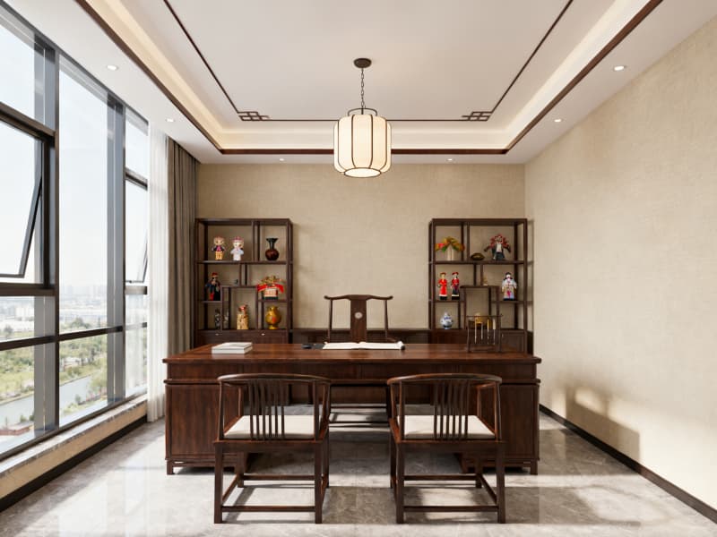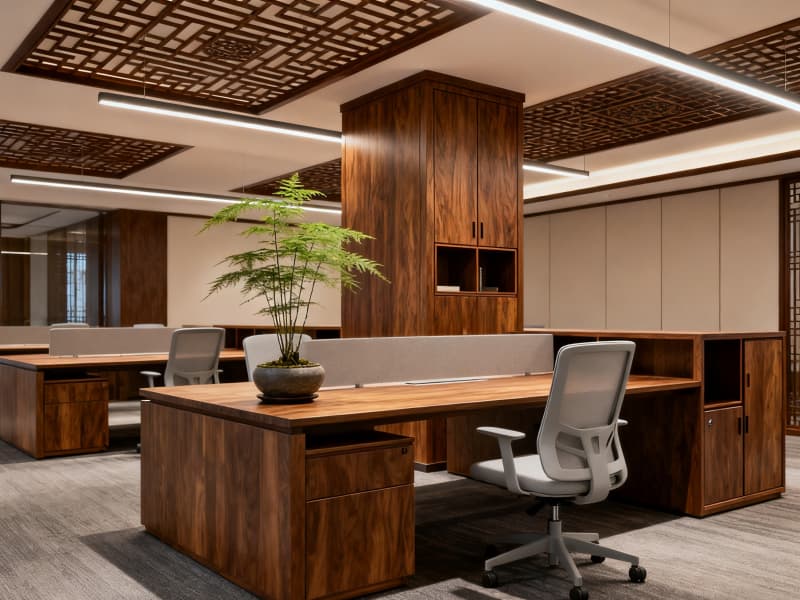 空間布局上,科學(xué)劃分開放辦公區(qū)、獨(dú)立辦公室、會(huì)議室、休閑區(qū)等功能區(qū)域,優(yōu)化動(dòng)線設(shè)計(jì),保證辦公效率與使用舒適度。色彩以淺色系為基底,搭配深棕色實(shí)木元素,營造雅致、沉穩(wěn)的視覺效果,同時(shí)通過落地玻璃窗、中式格柵吊燈等設(shè)計(jì)引入充足自然光線,減少空間壓抑感。