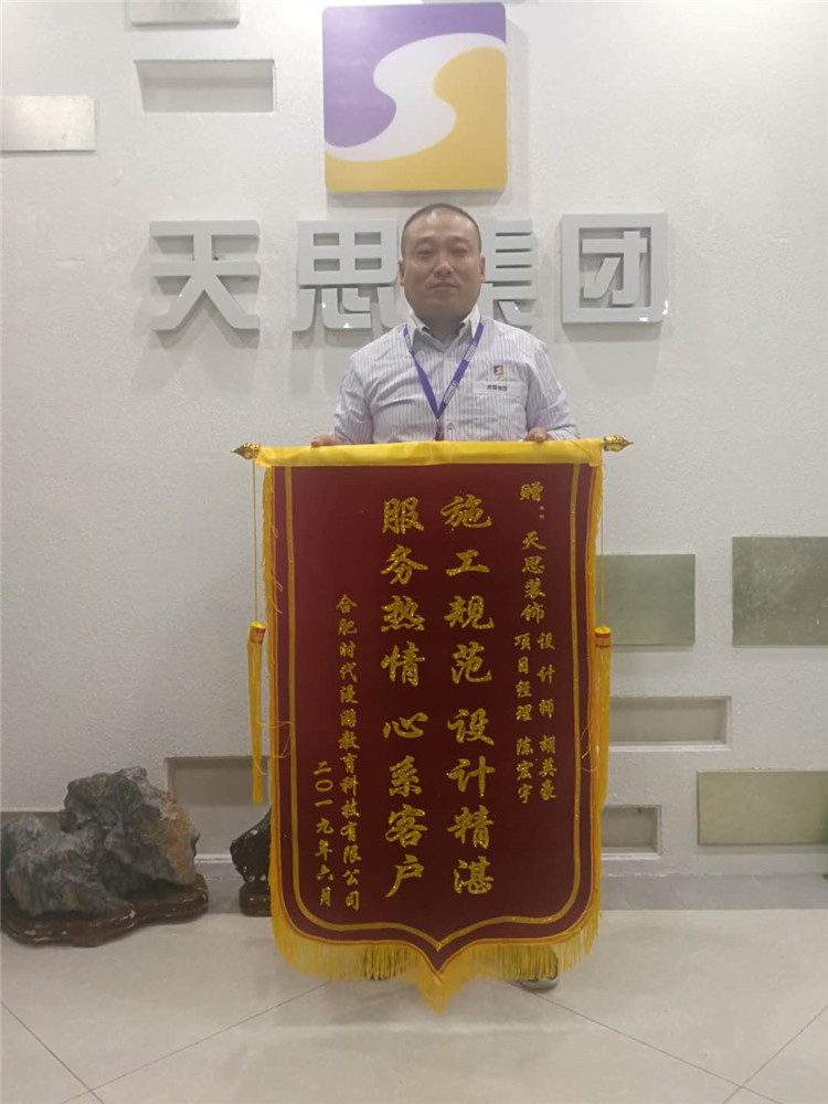 業(yè)主在百忙之中特意來(lái)天思裝飾贈(zèng)送錦旗,對(duì)施工項(xiàng)目經(jīng)理陳工的施工質(zhì)量和服務(wù)贊不絕口.業(yè)主道:他懷著萬(wàn)分感激之情,向陳工、胡工及天思裝飾全體員工表示真誠(chéng)的感謝和良好的祝愿. 錦旗上寫著"施工規(guī)范 設(shè)計(jì)精湛 服務(wù)熱情 心系客戶"16個(gè)燙金大字,錦旗雖小,分量厚重.