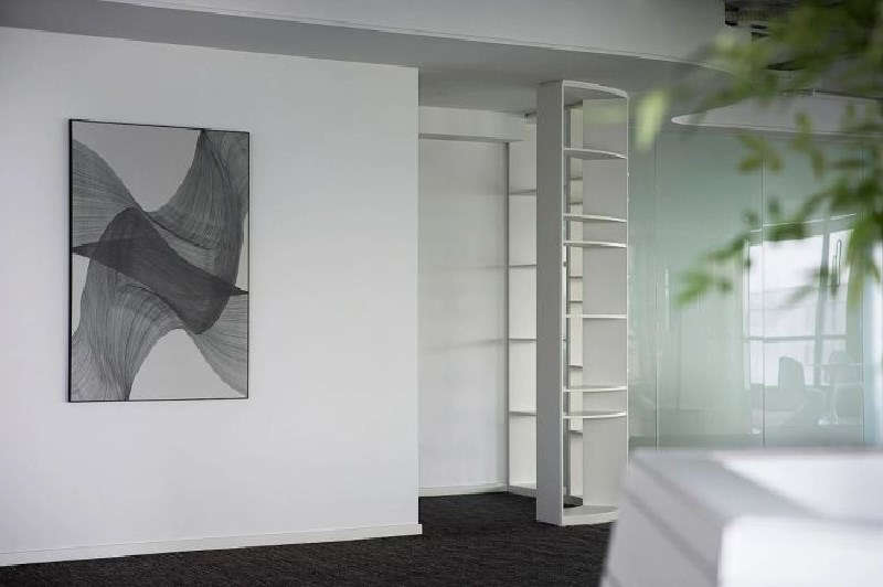 不同于以往辦公一味追求的對稱藝術,經由橫平豎直的線條勾勒,本案布局在硬朗的輪廓下規整有序,又與弧形彎道相輔相成,運用圓角規避各處尖銳轉折,柔和視覺。