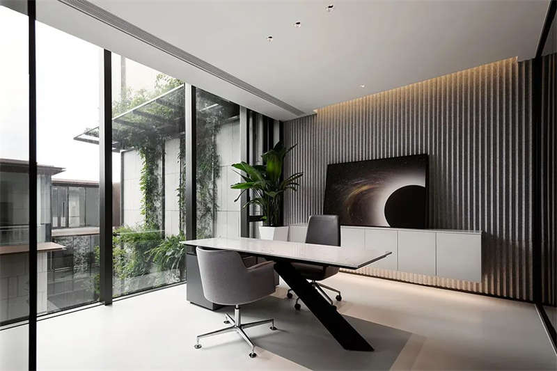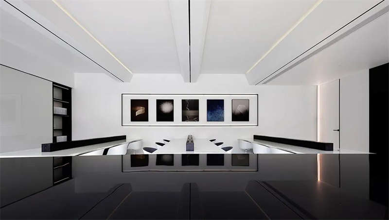 建筑是凝固的音樂(lè),音樂(lè)是流動(dòng)的建筑。二、三層分別是開(kāi)敞式辦公和高管辦公區(qū),空間整體黑白分明、線條硬朗,像是鋼琴的黑白鍵,揮灑自如,動(dòng)人的旋律,或悠揚(yáng)或激昂。