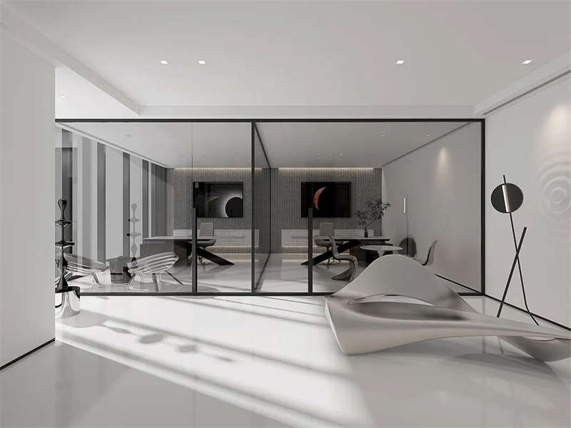 接待區(qū)以沙發(fā)組和會(huì)議室實(shí)現(xiàn)休息、接待、和會(huì)議功能。沙發(fā)地毯圍合成舒適的功能區(qū),落地?zé)簟⑺囆g(shù)裝置讓這里更有會(huì)客廳的親切感,灰色與白色的搭配經(jīng)典時(shí)尚。