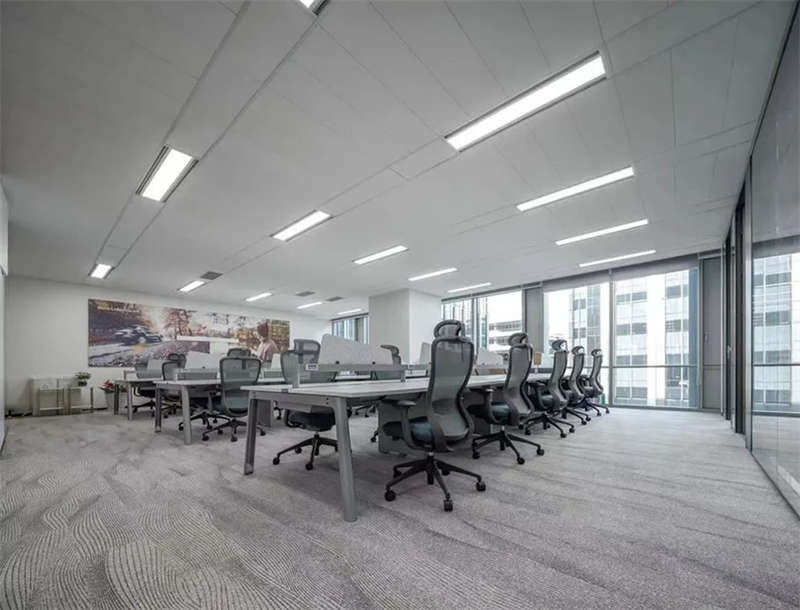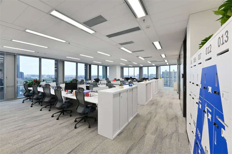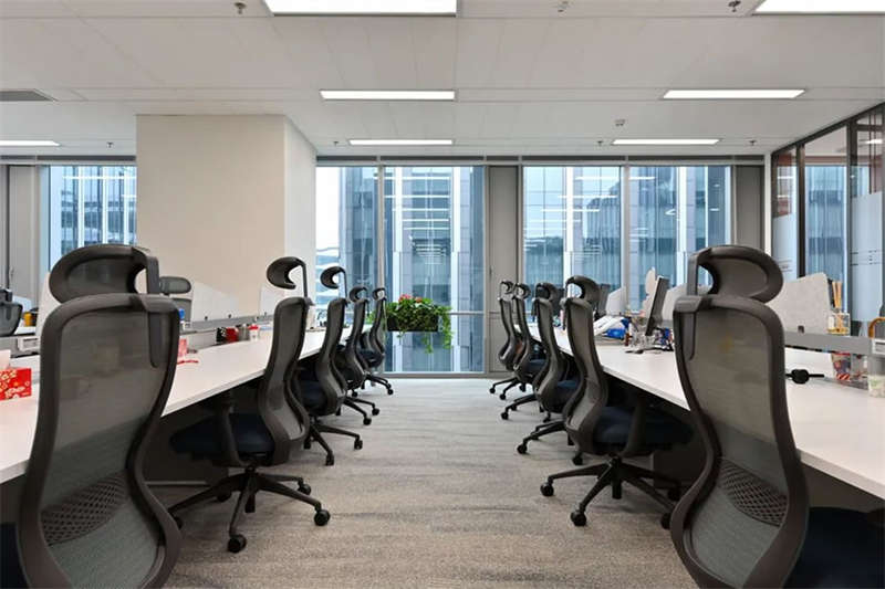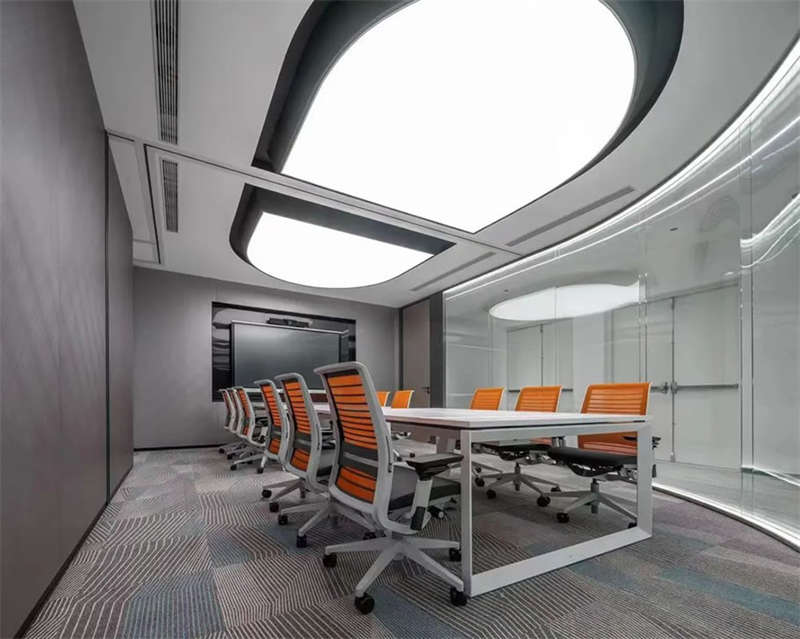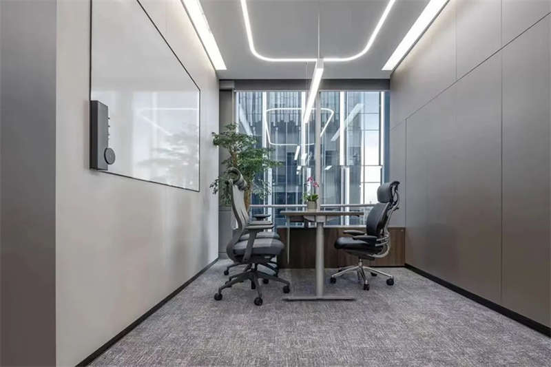 員工區部份選用了電動可調的升降辦公桌,以滿足員工個性化的需求,白灰色的家具搭配,混搭淺木色的休閑洽談區域,地面選用流線款長版的無膠水鋪裝的地毯相呼應。提升了空間品質和美感。