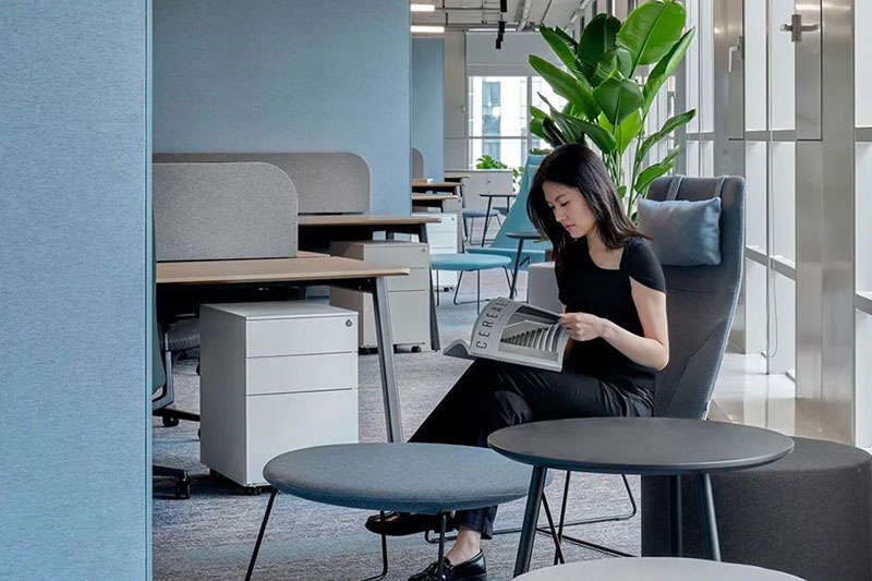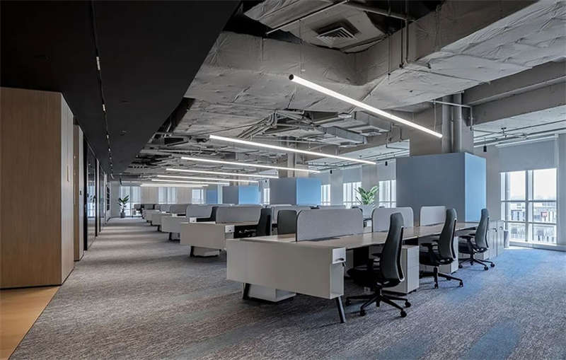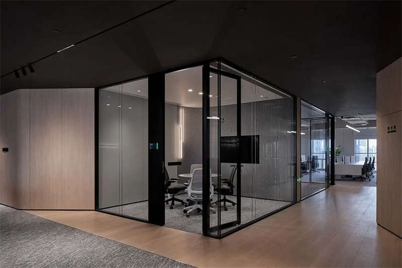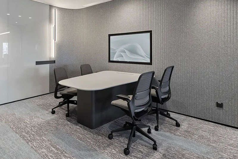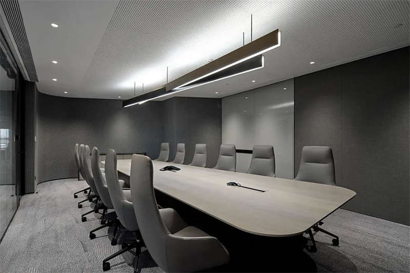 進(jìn)入會議空間,設(shè)計師刻意控制它的視覺張力,前區(qū)的體驗得以延續(xù),灰黑色調(diào)覆蓋目力所及并引入更多的柔性材料,專業(yè)、專注是會議空間的功能立本但也不乏我們對活力元素的照拂,每一個會議室我們都選擇了形式各樣的藍(lán)色地毯來裝點。