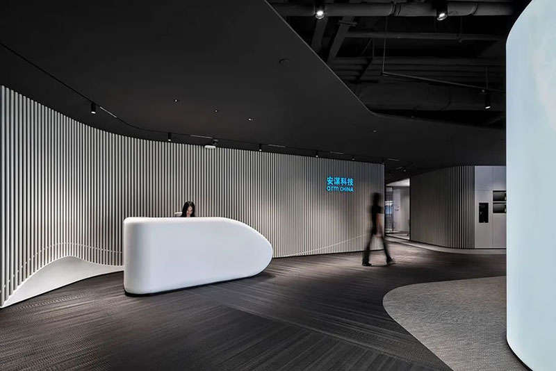 入戶的觀感尤為純粹,由一面數(shù)碼互動墻將視覺由電梯廳引入內(nèi)部,極致的暗調(diào)勾勒出明快的線性淺灰色logo墻并有向上延伸之感,自發(fā)光logo猶如秘境中的湛藍(lán)熒光寶石恬靜而自信的展現(xiàn)自我,黑色Bolon毯紋理隨著視覺的變化不斷變幻伴隨空間動線,將訪客緩緩引入內(nèi)場直達(dá)休憩區(qū),猶如數(shù)字科技傳動向前并引領(lǐng)未來。此處形式多樣的家具配合綠樹盈動,構(gòu)造了訪客和員工之間交融和平衡的靈動空間。