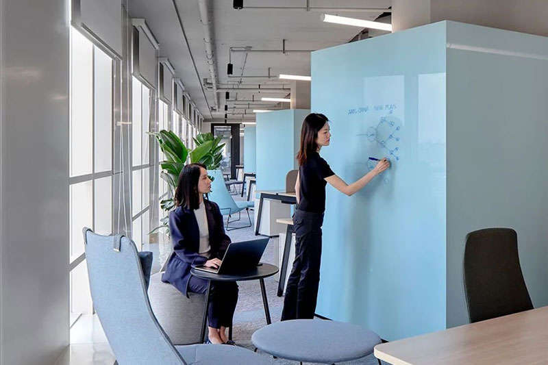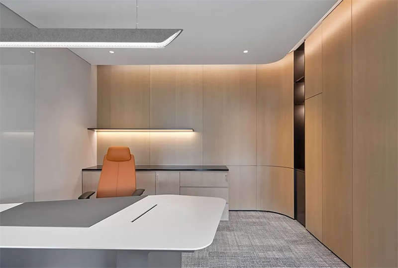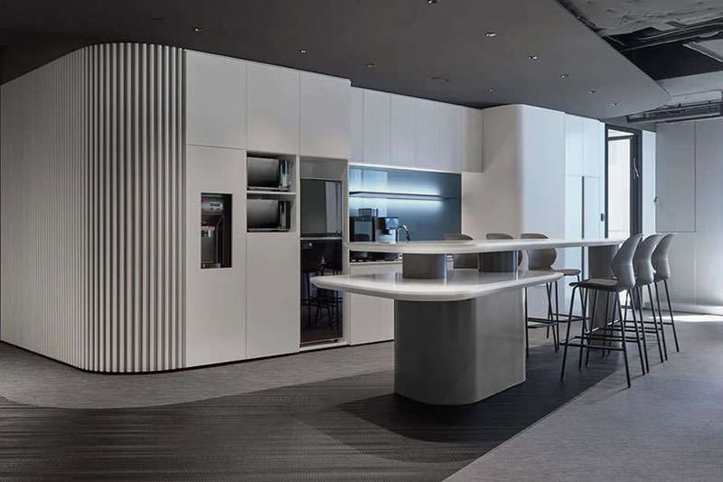 由于建筑不是專業(yè)寫字樓,全開放的租賃面積、過大的柱體、凌亂的工業(yè)管道天花也給設(shè)計提出了難題。為了平衡好行政辦公和會客及不同部門之間的功能分區(qū),設(shè)計師把打印、咖啡、小洽談休憩空間作為功能島置入整層的正中,合理分隔東西兩個工區(qū)并方便大家便捷使用。沿窗的柱體通過裝飾面的包裹和扭轉(zhuǎn)形成空間亮點,輔以休閑家具,簡短的洽談分享、小的會議討論在此得以解決,員工在介于室內(nèi)空間和自然窗光中獲得了獨特的體驗和助益。