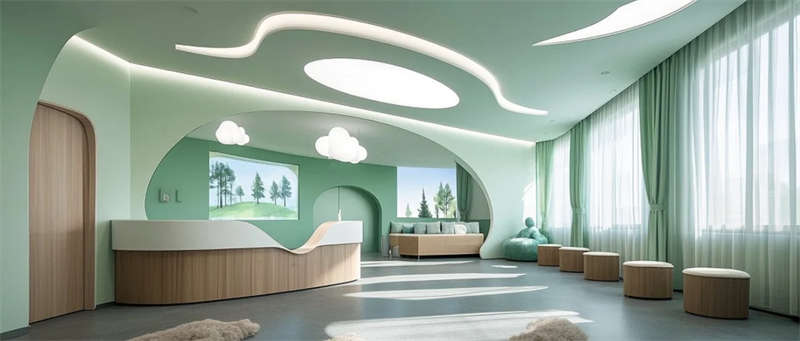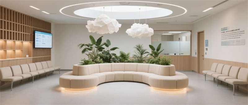 這個醫(yī)療空間以自然療愈為語言重塑傳統(tǒng)醫(yī)院體驗(yàn)。建筑內(nèi)部流動的淺木與灰綠色系,搭配原生綠植景觀墻,模糊了室內(nèi)外邊界,讓自然光與綠意成為治愈媒介。門診走廊的弧形墻面消解機(jī)構(gòu)冰冷感,兒童診區(qū)的森林投影與云朵軟包,用敘事化設(shè)計緩解診療焦慮。